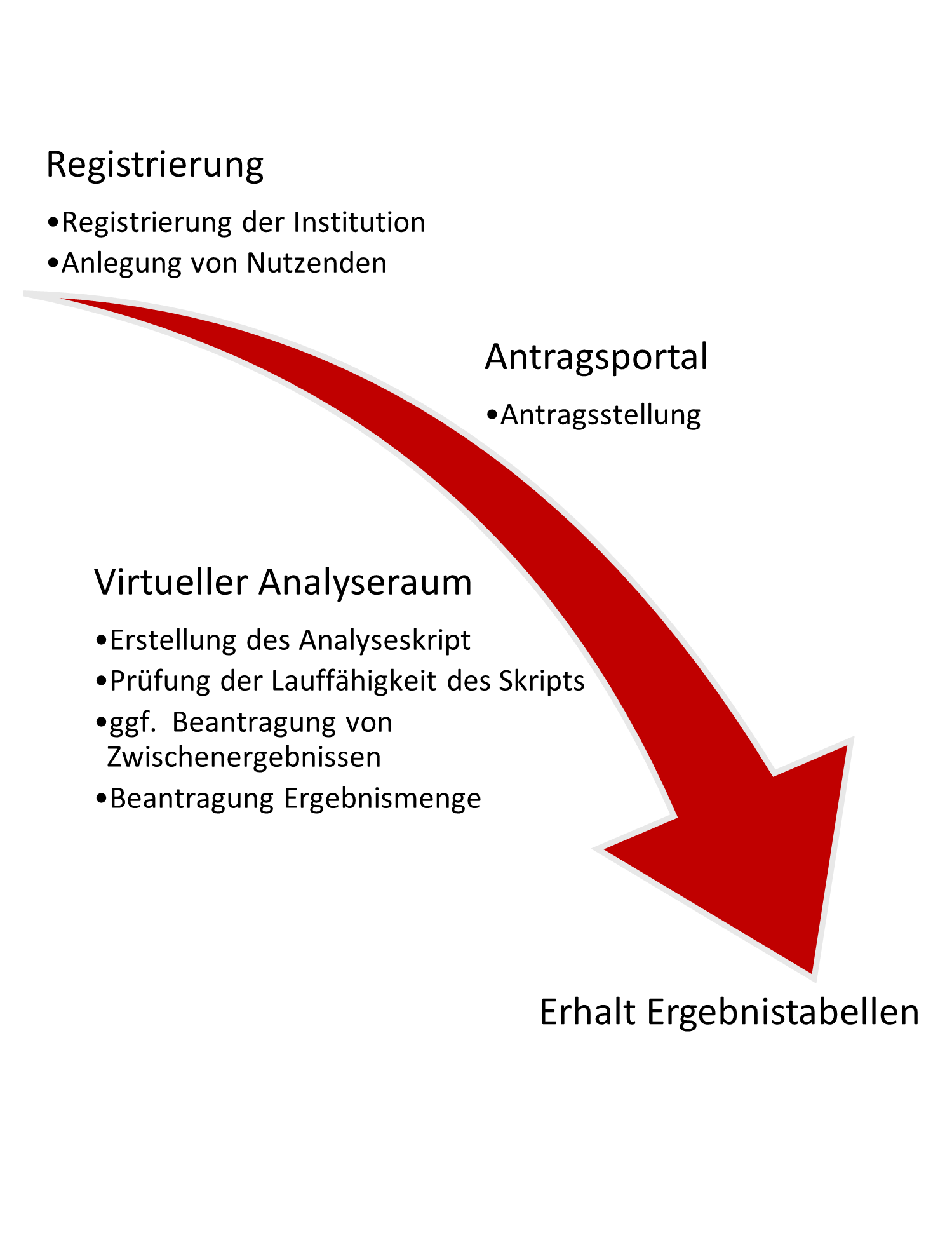 Bevor die Antragsstellung für ein Forschungsprojekt beim FDZ Gesundheit erfolgen kann, muss die entsprechende Institution durch eine beauftragte Person registriert werden. Danach können weitere Nutzende angelegt werden, denen verschiedene Rollen zugeteilt werden können, wie z. B. antragstellende oder datennutzende Personen. Im digitalen Antragsformular müssen anschließend umfangreiche Angaben zum geplanten Forschungsprojekt gemacht werden. Nach der inhaltlichen Prüfung und Freigabe des Antrags durch das FDZ Gesundheit wird ein antragsspezifischer Analyseraum eingerichtet. Hier können die Forschenden das Analyseskript erstellen und auf Lauffähigkeit prüfen. Wenn eine positive Lauffähigkeitsprüfung vorliegt, können Zwischenergebnisse bzw. die Ergebnismenge beantragt werden. Die Ergebnismenge wird nach Prüfung durch das FDZ Gesundheit der antragstellenden Person in Form von aggregierten Tabellen zur Verfügung gestellt.